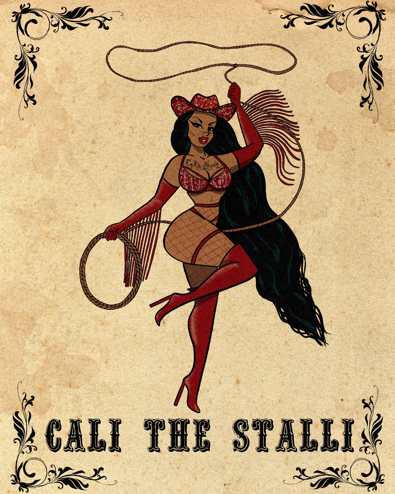 I designed and drew a pin-up illustration of Cali The Stalli to be used on merchandise.